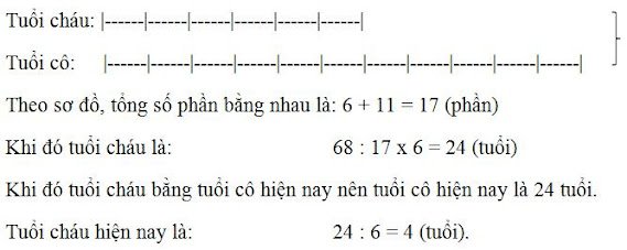 Bài 4: Năm nay tuổi cô gấp 6 lần tuổi cháu. Đến khi tuổi cháu bằng tuổi cô hiện nay thì tuổi của hai cô cháu cộng lại bằng 68. Hỏi hiện nay mỗi người bao nhiêu tuổi?