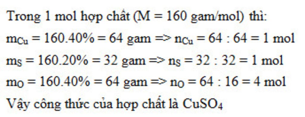 Câu 27: Một hợp chất có thành phần các nguyên tố là 40% Cu, 20% S. 40% O. Hãy xác định công thức hóa học của hợp chất (biết khối lượng phân tử của hợp chất là 160 amu).